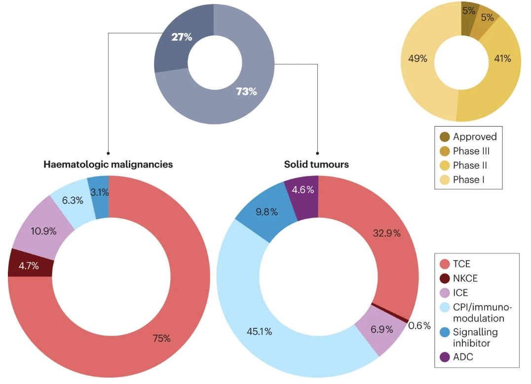 目前,有300多項(xiàng)臨床試驗(yàn)涉及200多種不同的雙特異性抗體分子,其中約75%用于治療實(shí)體瘤,25%用于治療血液系統(tǒng)惡性腫瘤。有10種bsAb藥物已被批準(zhǔn)用于癌癥治療,其中9種在美國(guó)和/或歐洲獲得批準(zhǔn),cadonilimab在中國(guó)獲得批準(zhǔn)。到目前為止,臨床中開發(fā)的很大一部分bsAbs已經(jīng)處于后期階段(II期和III期)。另外,可以發(fā)現(xiàn),治療實(shí)體瘤的bsAbs主要由免疫調(diào)節(jié)劑主導(dǎo),包括雙CPI(約45%)和TCE(約33%),其次是靶向雙途徑、ICEs和ADC的bsAb。