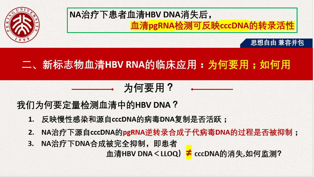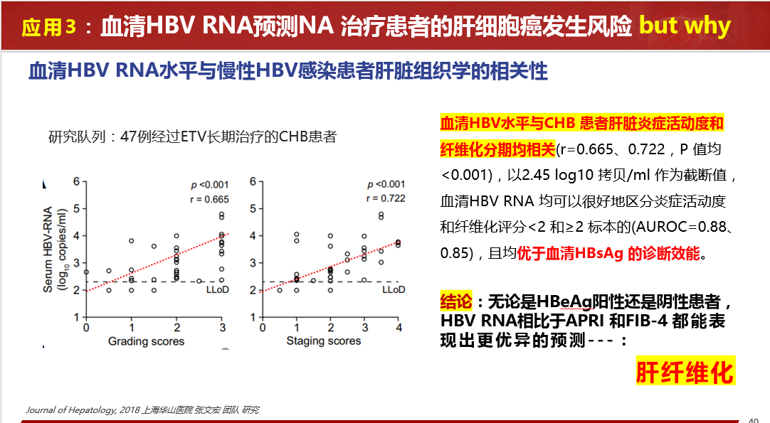 關(guān)于HBV RBA病毒樣顆粒的發(fā)現(xiàn)、血清HBV RNA的產(chǎn)生路徑、存在形式、來源和特點等做了詳細闡述,同時分享國內(nèi)肝病領(lǐng)域張文宏研究團隊等工作成果,血清HBV RNA水平反映肝內(nèi)cccDNA的轉(zhuǎn)錄活性,血清 HBV pgRNA,是NA治療下HBV DNA < LLOQ后,能夠反映患者肝組織內(nèi)是否有cccDNA活躍轉(zhuǎn)錄的唯一指標。