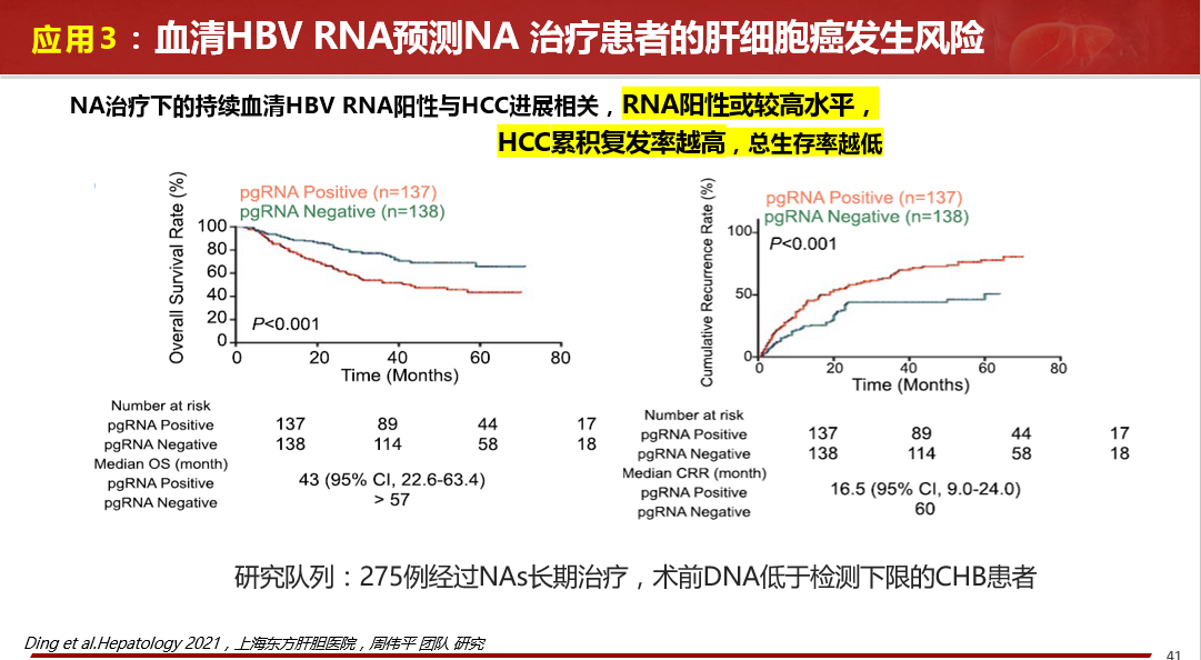 ★ NA治療下的持續(xù)血清HBV RNA陽性與HCC進展相關(guān),RNA陽性或較高水平,HCC累積復發(fā)率越高,總生存率越低。