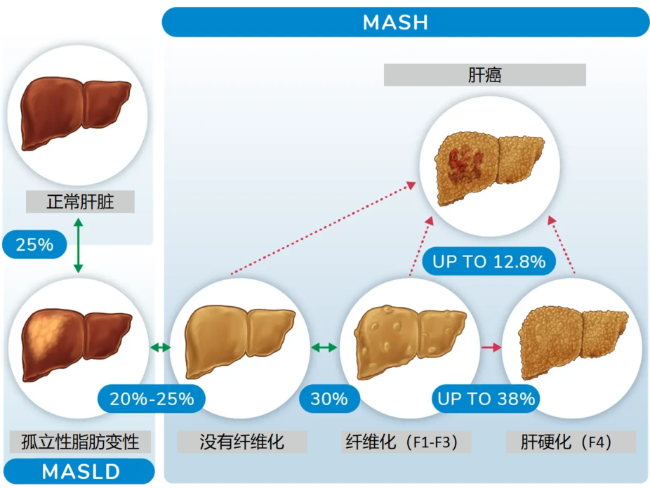MASLD疾病譜包括單純性脂肪肝(MAFL)、脂肪性肝炎(MASH)及其相關(guān)纖維化和肝硬化。隨著肥胖和2型糖尿?。═2DM)的流行,全球MASLD患病率和發(fā)病率不斷增高。據(jù)報道,全球MASLD的發(fā)病率約20-35%,其中約10-30%的患者患有MASH。