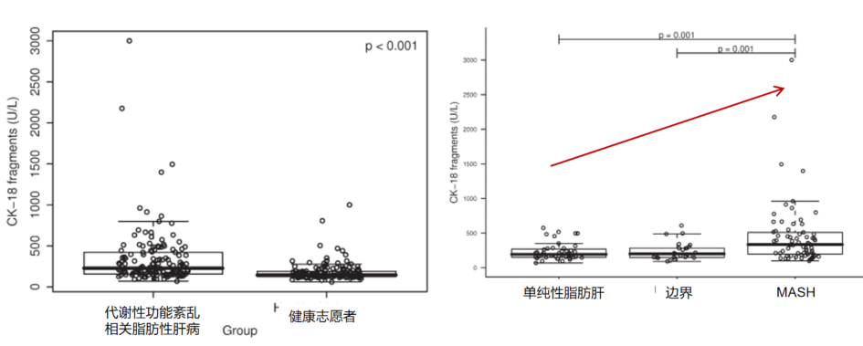 《脂肪性肝病診療規(guī)范化專家建議》、《非酒精性脂肪肝肝病防治指南2018版》也都明確了,對于脂肪性肝病患者,CK18可評估肝臟炎癥程度,并且合并Met S、T2DM、血清氨基酸轉(zhuǎn)移酶和(或)CK18持續(xù)增高的NAFLD患者是NASH的高危人群?!?/span>