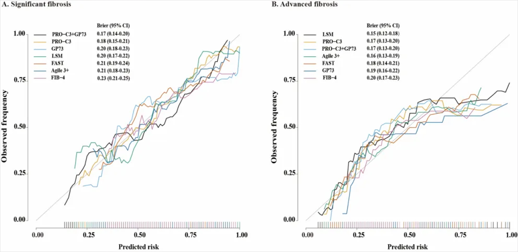 校準曲線也顯示,在診斷顯著纖維化方面,PRO-C3聯合GP73的Brier評分最低(0.17),其次是PRO-C3、LSM、GP73、FAST、Agile 3+、FIB-4(圖2A)。在診斷進展期纖維化方面,PRO-C3和PRO-C3聯合GP73模型的Brier評分均為0.17,其診斷效能優(yōu)于FIB-4(0.20)和FAST(0.18)(圖2B)。