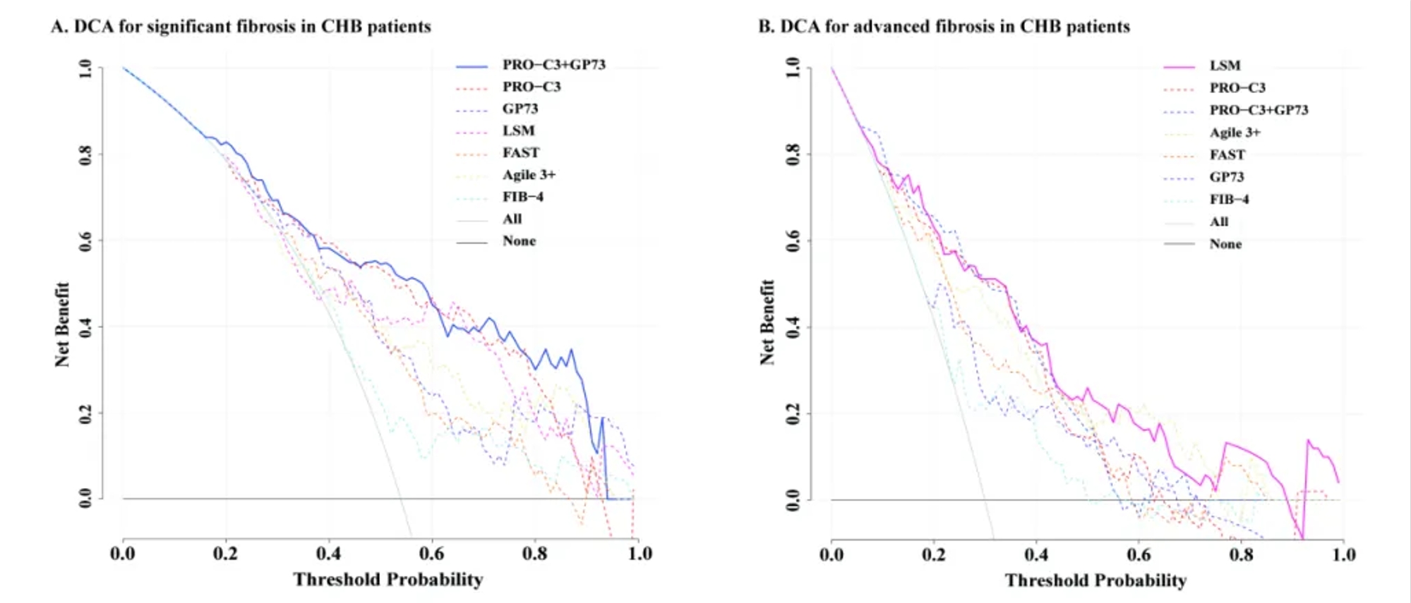 圖3. 不同無創(chuàng)檢測預測慢性乙型肝炎患者纖維化效能的決策曲線分析。(A)顯著纖維化;(B)進展期纖維化