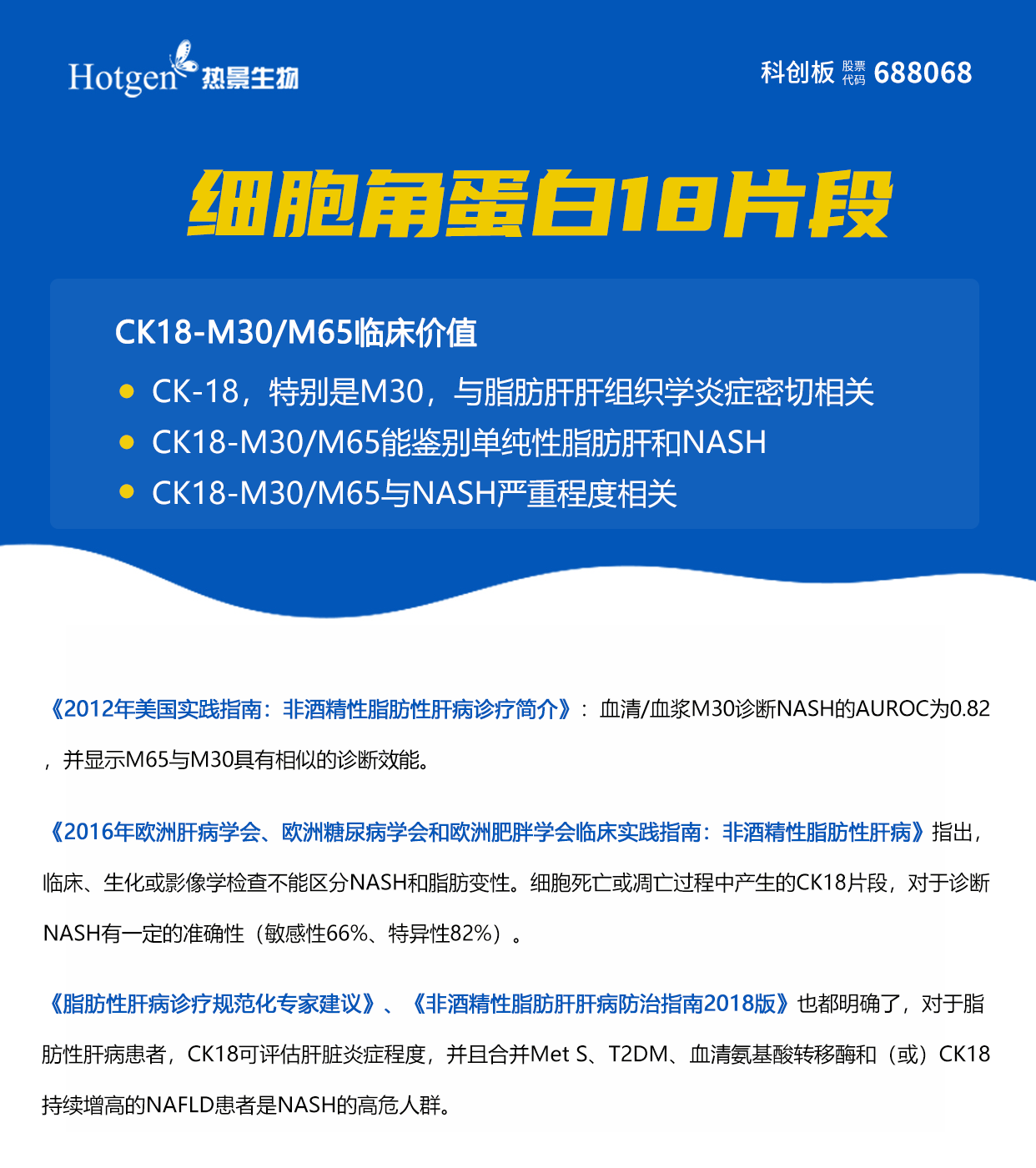 ? 臨床價(jià)值:作為國(guó)際公認(rèn)的脂肪性肝炎(NASH)輔助診斷指標(biāo),CK18檢測(cè)可聯(lián)動(dòng)肝纖維化評(píng)估,為超3億中國(guó)MAFLD患者提供從篩查到療效監(jiān)測(cè)的全周期管理方案。