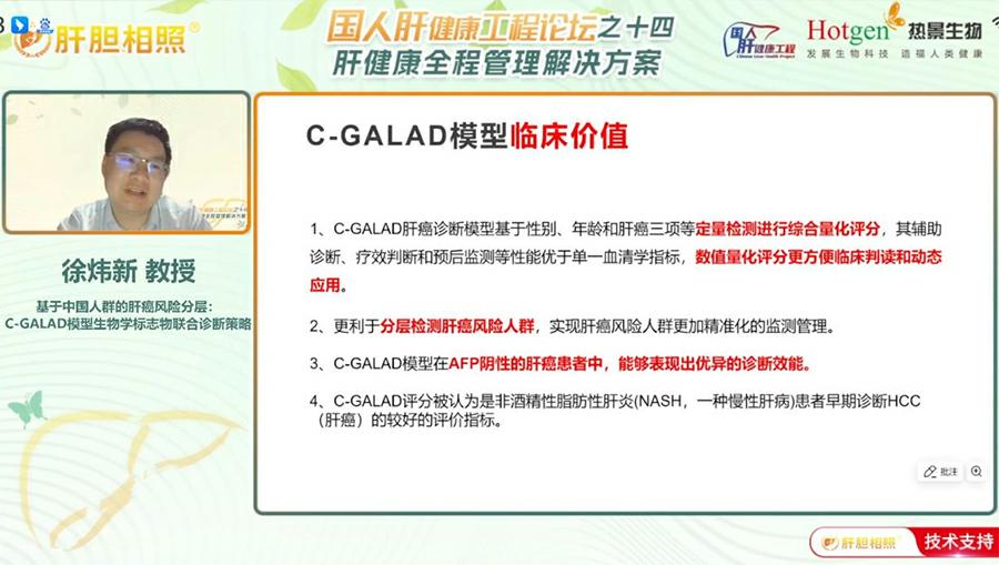 上海交通大學(xué)醫(yī)學(xué)院附屬仁濟(jì)醫(yī)院嘉定分院檢驗科的徐煒新教授圍繞肝癌早篩技術(shù)革新發(fā)表主題報告,他深入解析C-GALAD模型的臨床價值與應(yīng)用前景,為肝癌防控提供新策略。現(xiàn)狀與突破----我國肝癌早期診斷率低,傳統(tǒng)超聲聯(lián)合AFP檢測對早期小肝癌敏感性不足?;凇逗D鲜≡缙诟伟┖Y查實施方案》將“肝癌三項”(AFP、AFP-L3%、異常凝血酶原)納入常規(guī)篩查,徐主任指出,多標(biāo)志物聯(lián)合檢測成為破局關(guān)鍵:AFP-L3%提升惡性鑒別特異性,異常凝血酶原(DCP)反映腫瘤侵襲性,三者互補顯著提高早診效能。 C-GALAD模型:本土化創(chuàng)新典范----針對中國80%以上肝癌由乙肝驅(qū)動的人群特征,熱景生物研發(fā)的C-GALAD模型,整合年齡、性別與“肝癌三項”定量數(shù)據(jù),通過算法生成風(fēng)險評分,實現(xiàn)三大優(yōu)勢:①精準(zhǔn)分層:量化評分指導(dǎo)高危人群分級管理(如肝硬化患者每6個月聯(lián)合超聲篩查);②動態(tài)監(jiān)測:評分變化早于影像學(xué)提示復(fù)發(fā)風(fēng)險,助力療效評估;③指南推薦:獲《原發(fā)性肝癌診療指南(2024年版)》認(rèn)可,成為輔助診斷核心工具。臨床與政策協(xié)同---國內(nèi)外指南均強調(diào)風(fēng)險分層管理。徐主任呼吁推動“C-GALAD+超聲”聯(lián)合篩查普及,并展望未來融合液體活檢、AI影像技術(shù),構(gòu)建普惠化早篩體系。