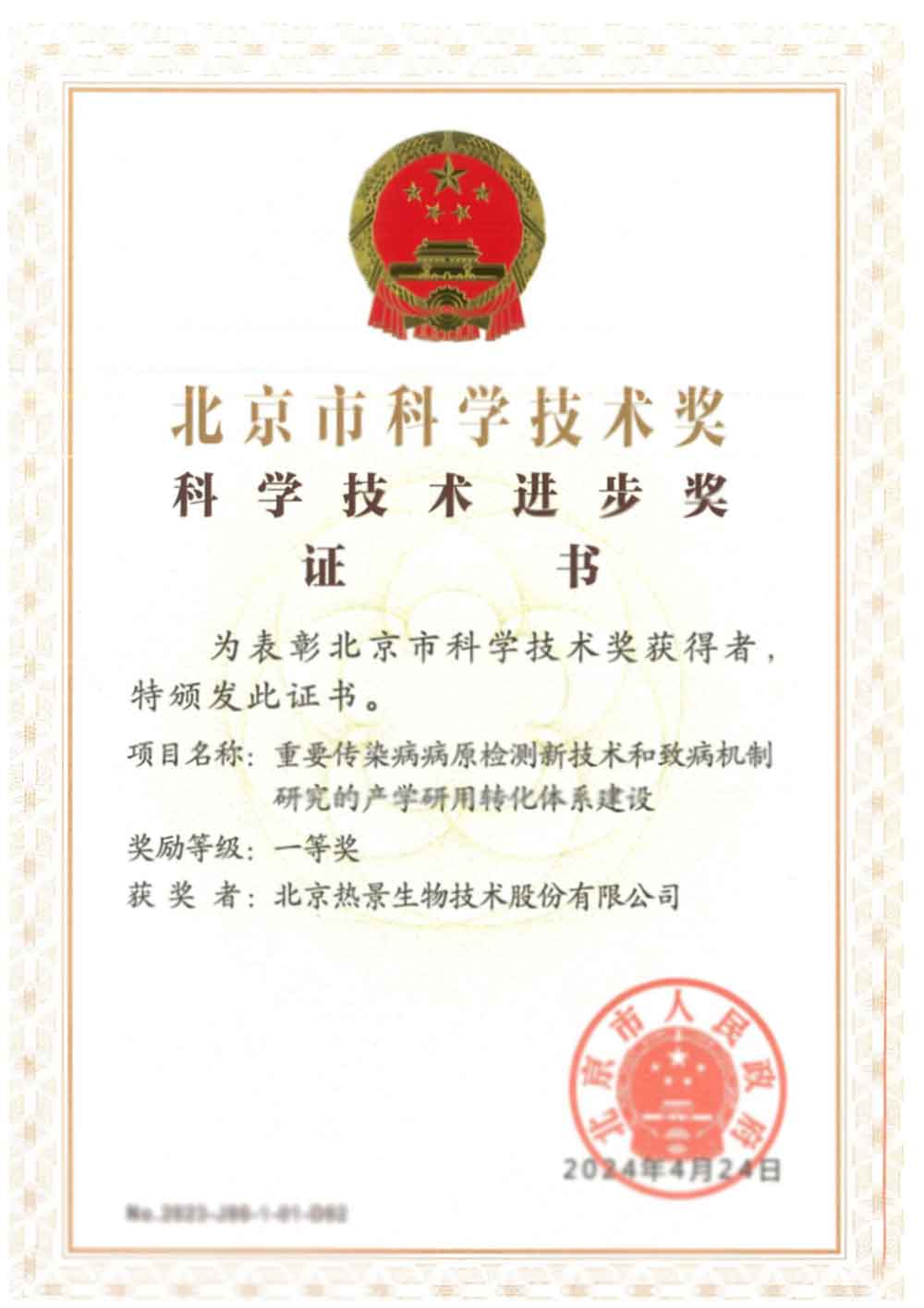 圍繞突發(fā)傳染病和生物安全需求,熱景生物持續(xù)推進應急檢測技術與應用體系建設,曾獲認定為“生物應急與臨床POCT 北京市重點實驗室”,系統(tǒng)布局從病原檢測技術研發(fā)到應急場景應用的關鍵環(huán)節(jié),形成了面向公共衛(wèi)生實際需求的技術轉(zhuǎn)化能力。2023年,由中國人民解放軍軍事科學院軍事醫(yī)學研究院、北京熱景生物技術股份有限公司、北京舜景生物醫(yī)藥技術有限公司聯(lián)合申報的“重要傳染病病原檢測新技術和致病機制研究的產(chǎn)學研用轉(zhuǎn)化體系建設”項目,榮獲北京市科學技術進步獎一等獎,標志著公司在重要傳染病檢測領域的科研協(xié)同能力與成果轉(zhuǎn)化水平獲得權威認可。